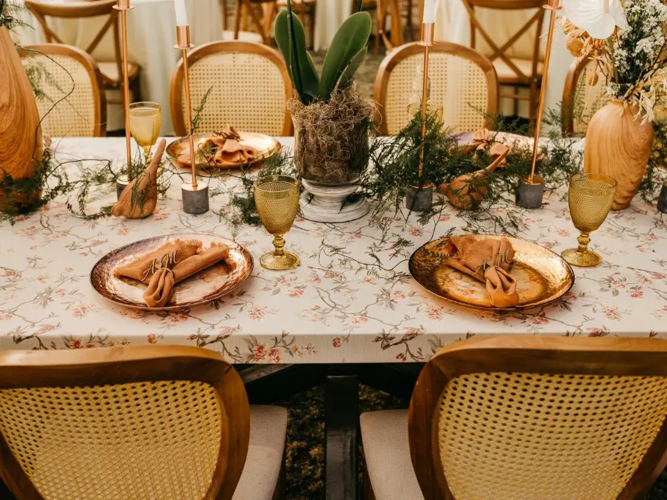 Hiring can be a practical option for larger items such as furniture, lighting, backdrops or charger plates, while also giving access to higher-quality finishes without needing to buy everything new.