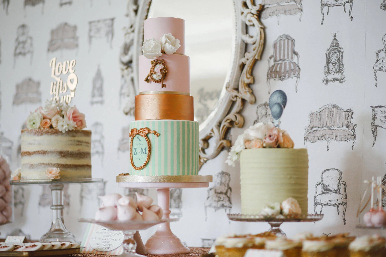 The wedding venue also plays a role. For example, in a barn or marquee with an uneven floor or shaky table, a shorter, stacked cake is safer. In contrast, a formal venue like a stately home is a great setting for a tall, four-tiered cake with pillars or separators for added height and grandeur.