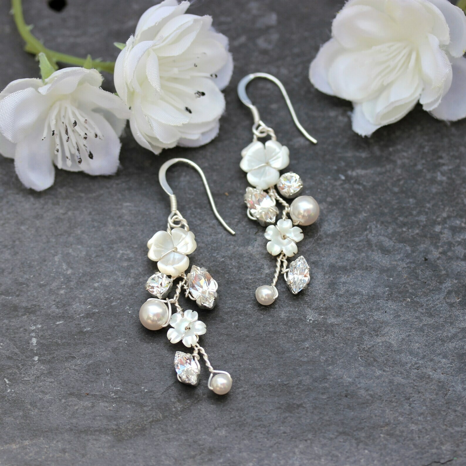 Floral Vine Bridal Earrings on Sterling Silver Ear Wires, Delicate Pearl Flowers & Crystal Trailing Drop Earrings £25.90